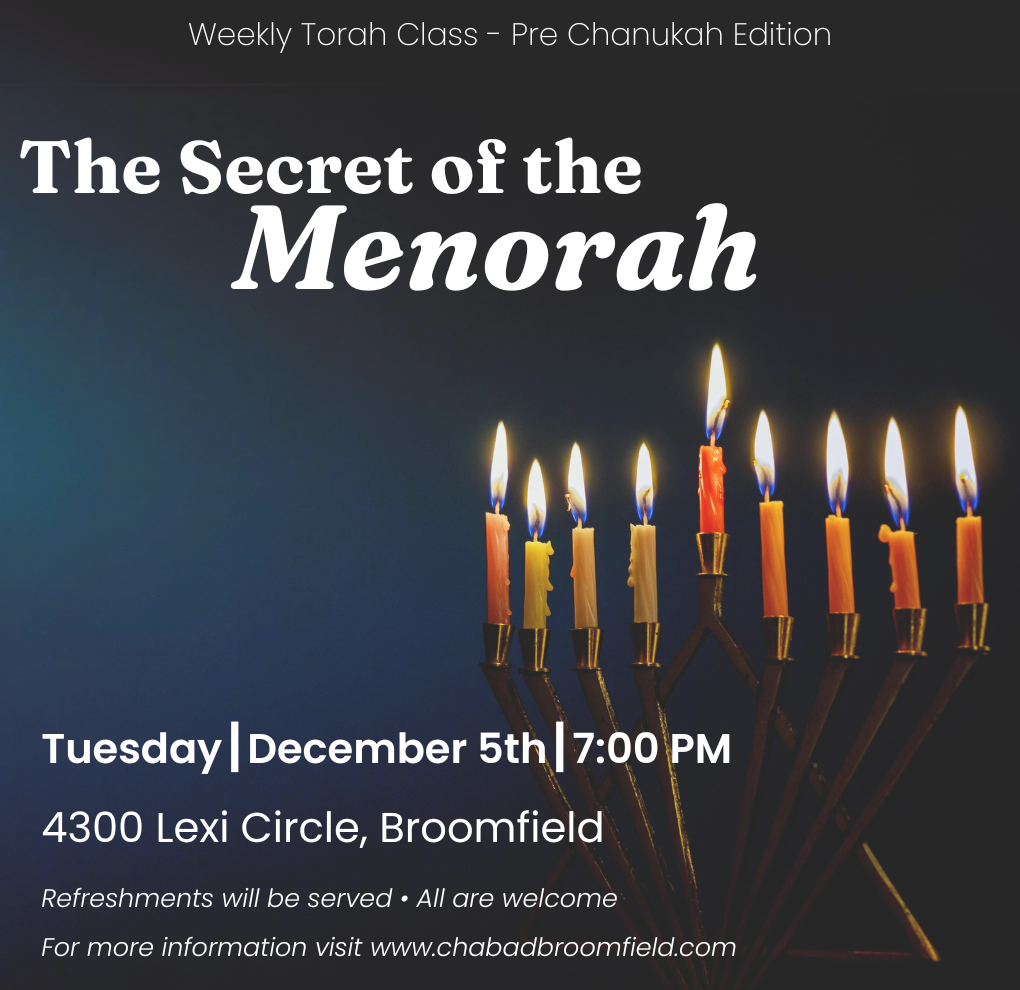 JOIN OUR WEEKLY TORAH CLASS TO LEARN ABOUT THE SECRET OF THE MENORAH AND THE ESSENCE OF CHANUKAH