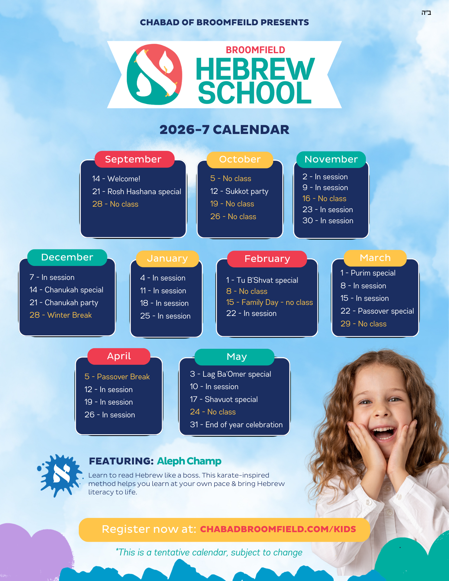 When: Sundays, 10:00–11:30 Where: Chabad of Broomfield, 3800 W. 144th Ave, Broomfield. Ages: 3–13